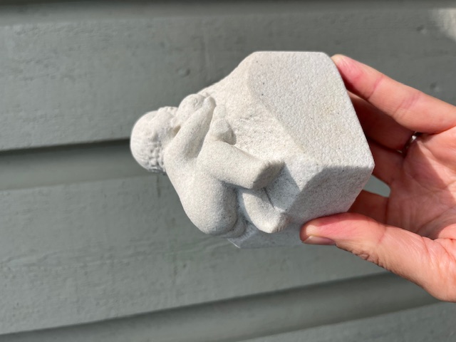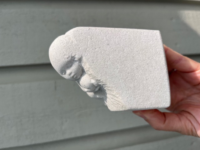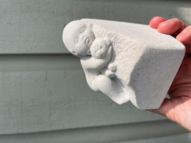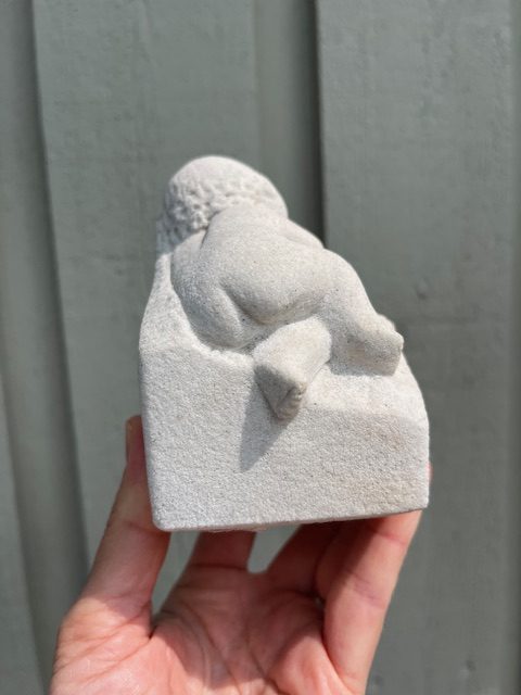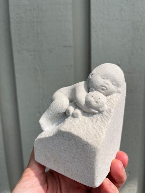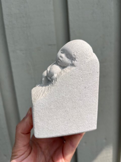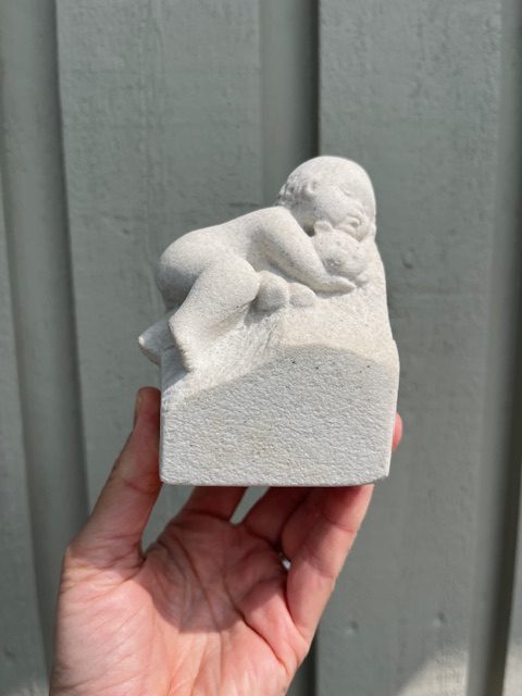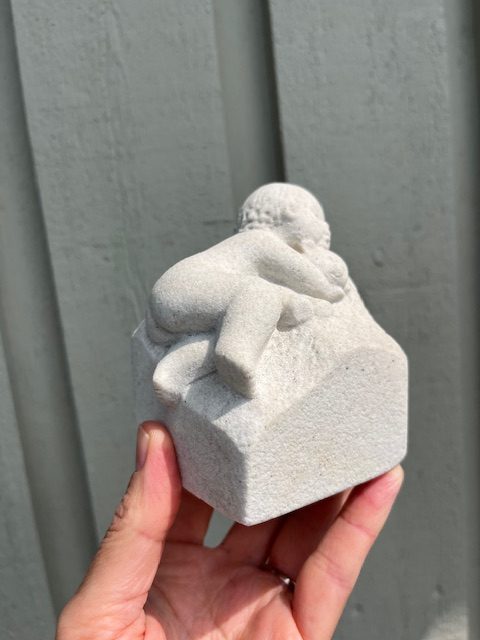 Bayby figur med bamse fra Stoneart Belgium. Fuguren er i pæn stand, den har dog lidt misfarvning fortil, kan sikkert fjernes.