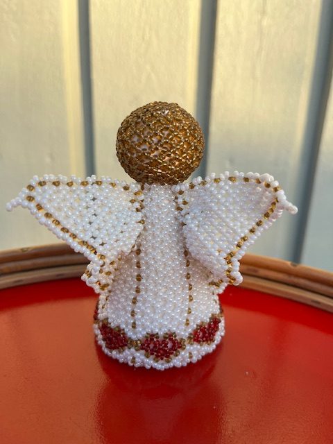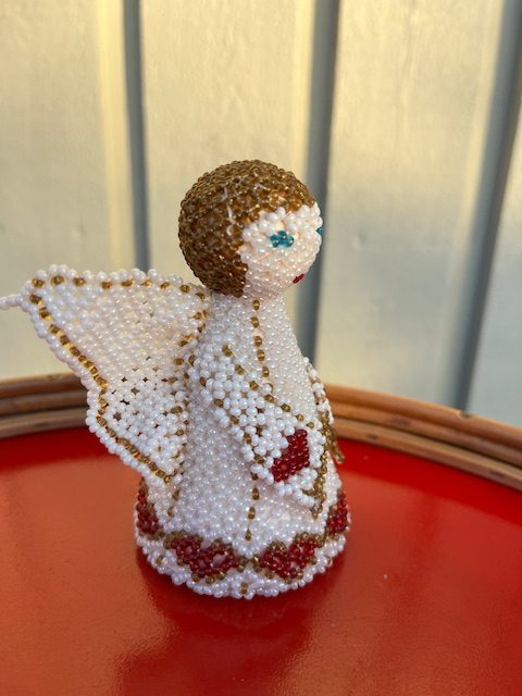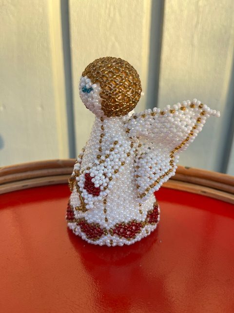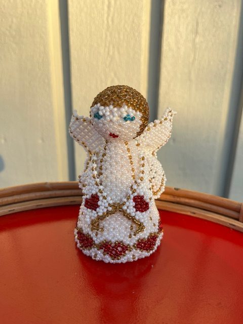 Perleengel i flot stand, den måler H: 10 cm og Ø: 6 cm.