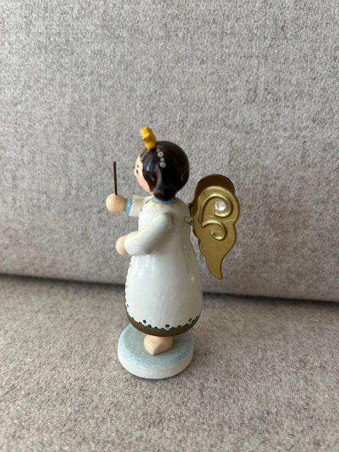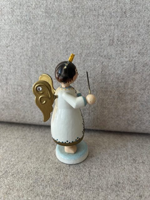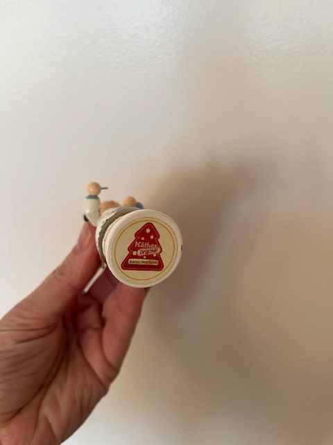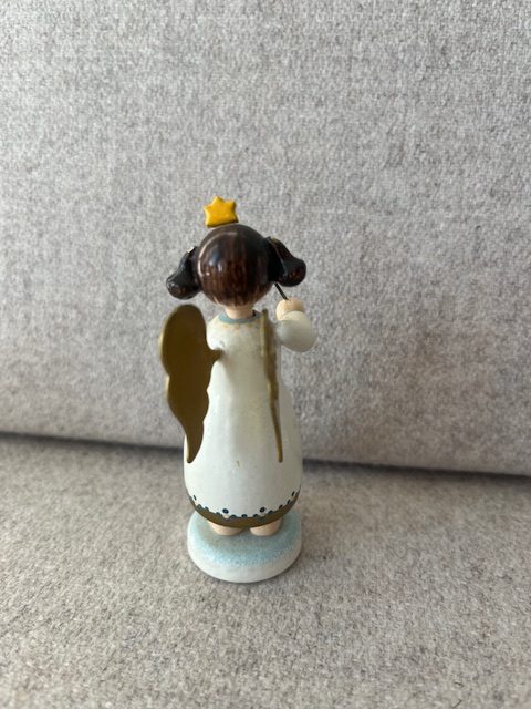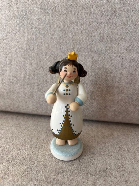 Hun måler 8 cm i højden og er i fin stand. Venstre arm er limet på!